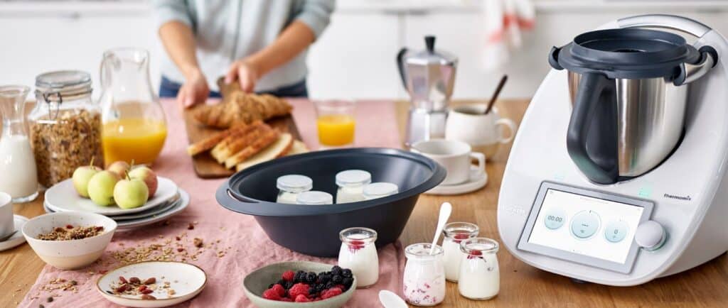 Le Thermomix TM6 concentre à lui seul la puissance d’une douzaine d’appareils. Il hache, mixe, pulvérise, mélange, fouette, pétrit, pèse, cuit lentement ou à la vapeur, sous vide, à haute température, et ce n’est pas tout : il sert aussi de bouilloire, sorbetière, yaourtière et fermenteur pour fromages maison.